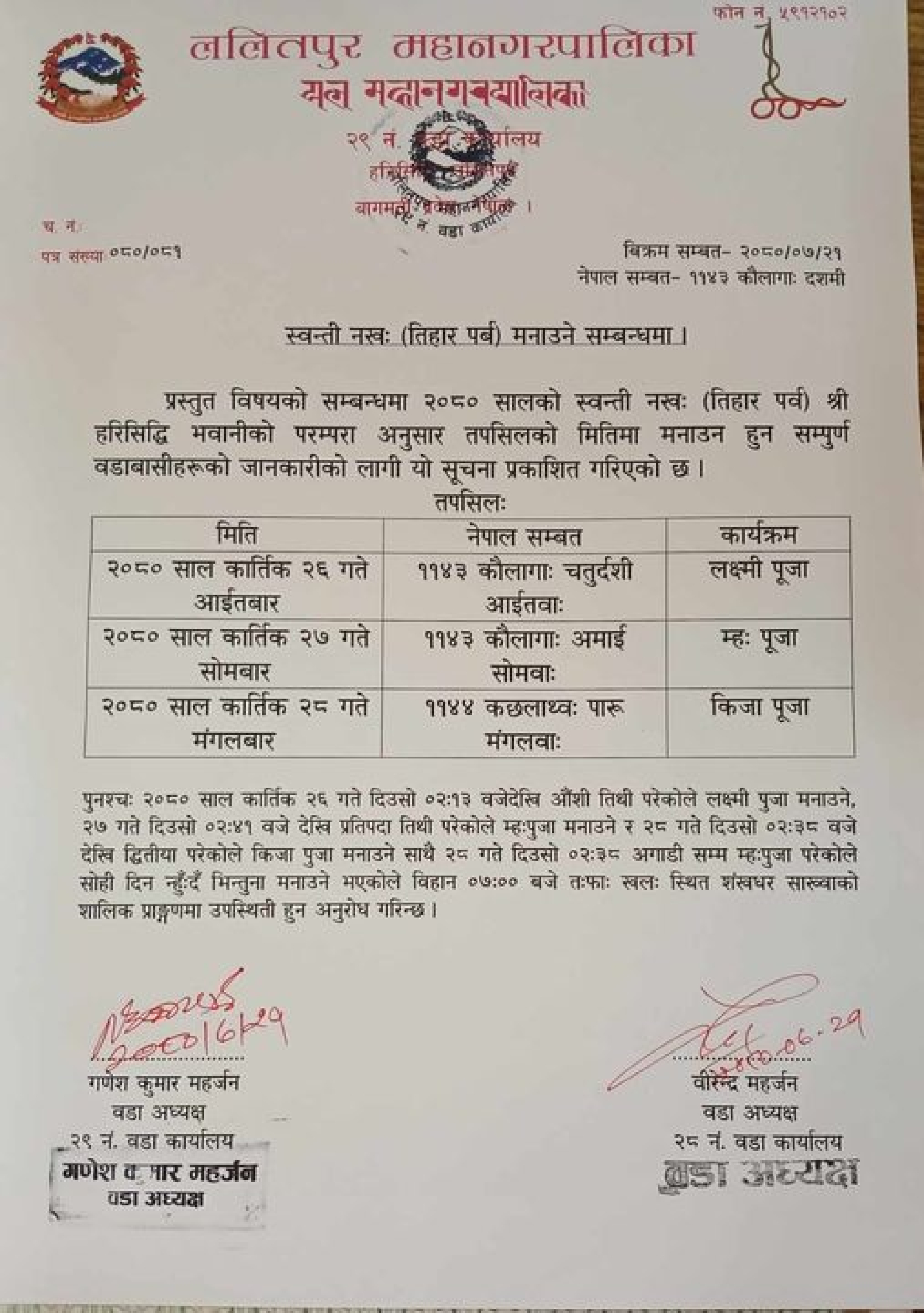 स्वन्ती नख (तिहार पर्व ) मनाउन सम्बन्धि सूचना ।।।